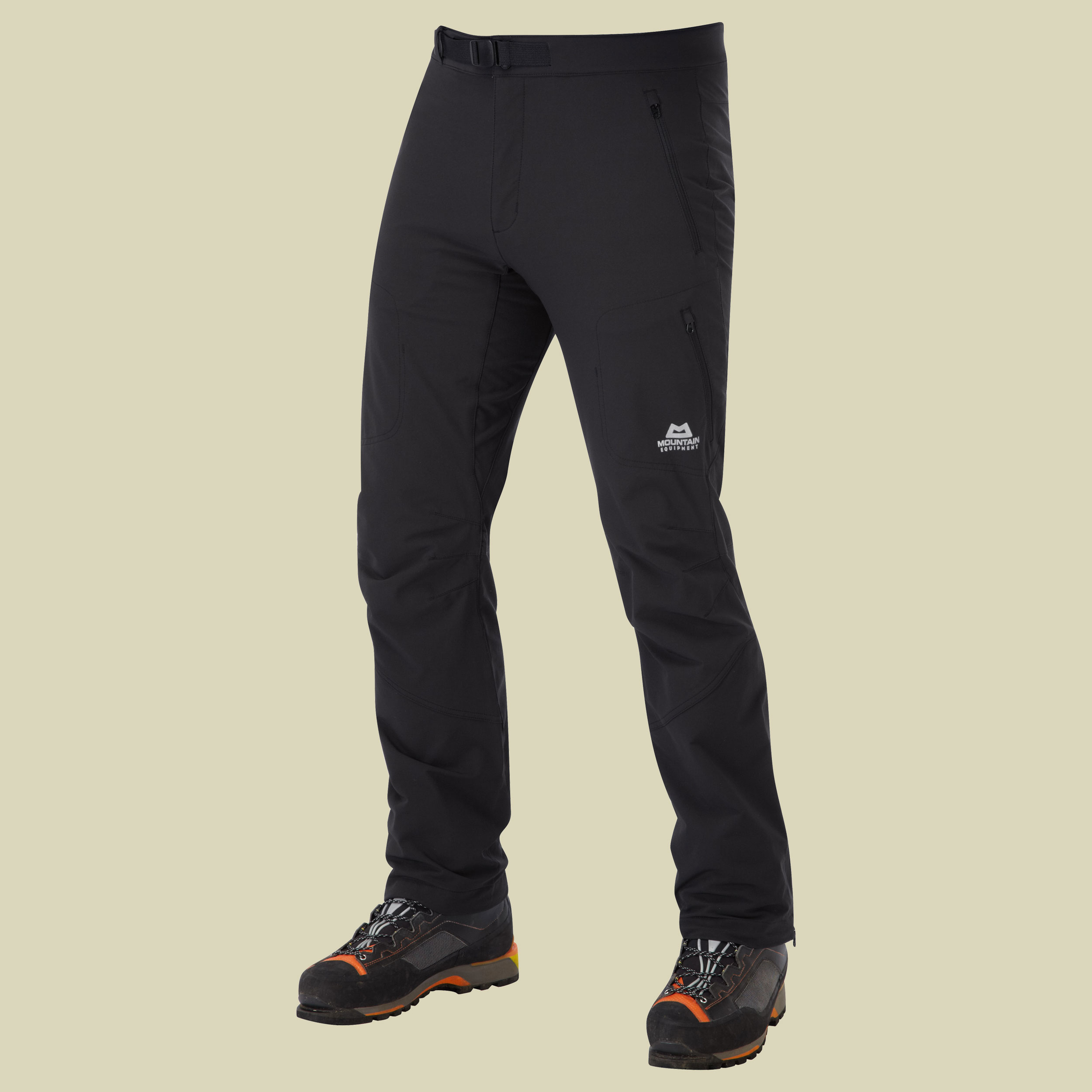 - und wasserdichtem Softshell; Rückseite aus dehnbarem und atmungsaktivem Material; elastischer Bund; verstellbare Beinabschlüsse; vorgeformte Knie; zwei Vordertaschen; zwei Oberschenkeltaschen mit Reißverschluss; Gürtelschlaufen.